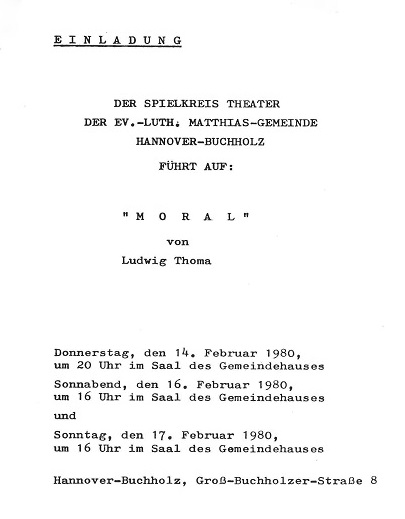 (c) TT Sigrid Jahnel mit Dieter Schmidt (?) | Liebe Zuschauer! Wir begrüßen Sie recht herzlich zu unserer Aufführung „Moral“ von Ludwig Thoma und hoffen, dass Sie zwei vergnügliche Stunden verleben. Leider müssen wir Ihnen mitteilen, dass Frau Marie Brussig, die den Part von Frau Bolland mit uns einstudiert und auch sonst uns wertvolle Anregungen vermittelt hat, erkrankt ist. Für sie hat dankenswerterweise Frau Heide Ulbrich kurzfristig die Rolle übernommen. Wenn Ihnen unsere Aufführung gefällt, bitten wir Sie am Ausgang um eine Spende, mit der Sie unsere weitere Arbeit unterstützen (z.B. sind die beiden Scheinwerfer aus Spenden früherer Aufführungen mitfinanziert!) und die Abgaben an den Deutschen Theaterverlag mittragen. Herzlichen Dank. |